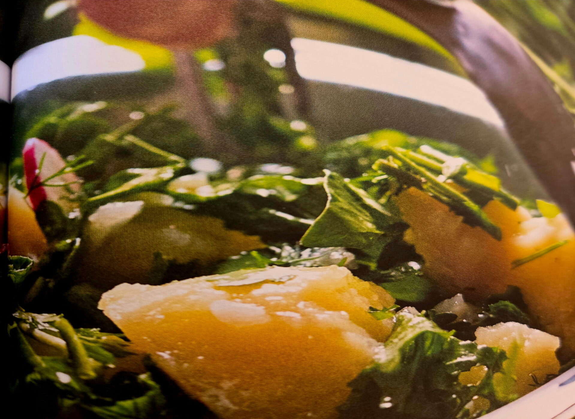 Als de aardappels zijn afgekoeld, doe ze in een grote kom en giet er de dressing overheen. Roer goed om.